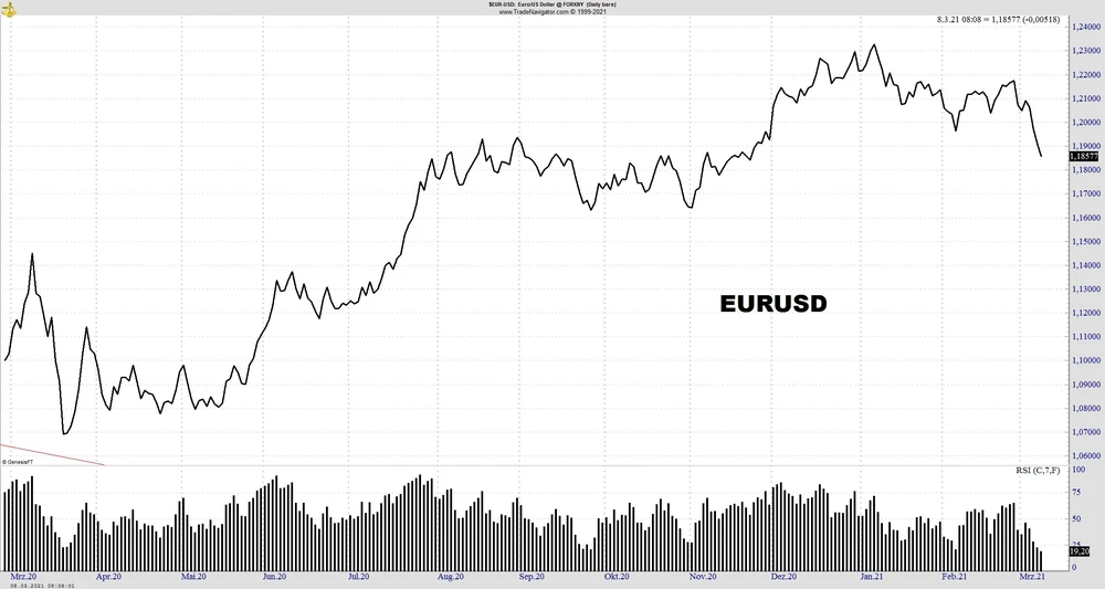 Im Frühjahr 2020 erreichte der Euro seinen niedrigsten Stand gegenüber dem US-Dollar seit 2017. Ein rasanter Anstieg folgte und ließ die Währung bis auf 1,23495 Euro Anfang Januar 2021 ansteigen. Seitdem herrscht Euro-Ausverkauf an den Märkten: Ein vorläufiges Intra-Day-Tief bei 1,18585 wurde heute morgen markiert. Damit nähert sich der Kurs gefährlich nahe der 200 Tageslinie bei 1,1814 Euro.