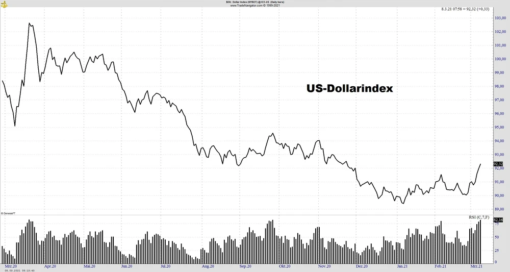 Der US-Dollar profitiert von den steigenden Zinsen in den USA. Am Freitag wurde der Markt dann zusätzlich noch von starken US-Arbeitsmarktdaten überrascht. Zu guter Letzt hat sich die Euro-Zone im Umgang mit der Pandemie nicht gerade mit Ruhm bekleckert. Bereits die dritte Woche in Folge wurden massiv Gelder aus Europa abgezogen und vermutlich in den Vereinigten Staaten investiert.