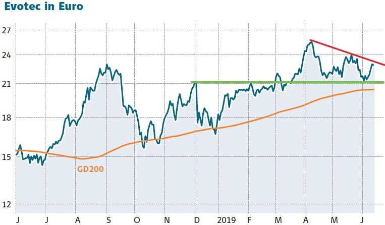 Die Aktie von Evotec hat in den vergangenen Tagen wieder deutlich zulegen können. Im Wochenvergleich ist das Papier sogar hinter Axel Springer (plus 11,0 Prozent) und Morphosys (+6,1 Prozent) mit einem Zugewinn von 5,7 Prozent der drittstärkste Wert im MDAX. Nun ist Evotec an einen wichtigen Widerstand herangelaufen: den seit Anfang April ausgebildeten kurzfristigen Abwärtstrend. Gelingt der Sprung darüber, wäre dies ein erstes starkes positives Signal. Wichtig wäre dann im Anschluss allerdings auch der schnelle Ausbruch über den Widerstandsbereich bei 24 Euro. Dann wäre der Weg frei in Richtung Mehrjahreshoch bei 25,83 Euro.