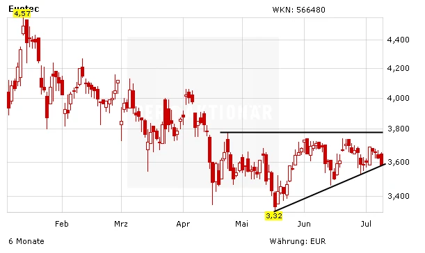 Ein Händler wertete die Kooperation zunächst allerdings neutral. Die finanziellen Auswirkungen seien vernachlässigbar und kommerziell interessante Projekte vermutlich Jahre entfernt. Die anfänglichen Gewinne musste die Evotec-Aktie im Laufe des Vormittags auch wieder abgeben. Mit einem Minus von 0,9 Prozent auf 3,59 Euro gehört der Wert zu den TecDAX-Verlierern. Nach den Verlusten seit Januar dieses Jahres, scheint sich in den vergangenen Wochen allerdings ein Boden auszubilden. Ein Kaufsignal würde jedoch erst der Sprung über die Marke von 3,80 Euro bringen. Bis dahin lassen Anleger das Papier auf der Watchlist.