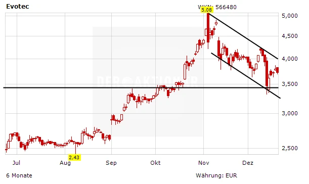 DER AKTIONÄR bewertet die Aussichten bei der Evotec-Aktie etwas optimistischer. Evotec besticht durch eine Vielzahl hochinteressanter Projekte und insbesondere auch Partnerschaften, um in Zukunft ordentlich Gewinne einfahren zu können. Langfristig orientierte Anleger, die sich des Risikos eines Investments in Biotech-Aktien bewusst sind, bleiben deswegen weiter investiert und sichern ihre Position mit einem Stopp bei 2,90 Euro nach unten ab. Auch die Analysten von getinsight Research präsentieren sich optimistisch. Sie bestätigten zuletzt ihre Kaufempfehlung mit einem Kursziel von 4,46 Euro für die Aktie von Evotec.