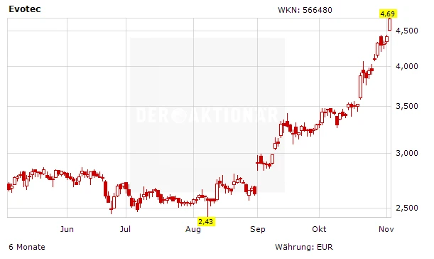 Die Aktie von Evotec ist derzeit der absolute Liebling unter den deutschen Biotech-Anlegern. Nahezu ohne Pause klettert der Wert von einem Jahreshoch zum nächsten. Auch zum Auftakt der neuen Woche hat die Aktie wieder Gas gegeben und ist am Ende mit einem Plus von mehr als sieben Prozent auf 4,75 Euro aus dem Handel gegangen. Damit war Evotec der mit Abstand größte Gewinner im TecDAX.