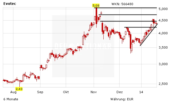 Sowohl aus charttechnischer als auch fundamentaler Sicht besteht aber kein Grund zur Beunruhigung. Evotec verfügt über ein hervorragendes Produktportfolio und exzellente Partner. Charttechnisch hat der Wert zuletzt erfolgreich die Unterstützung bei 4,24 Euro getestet. Zudem ist der kurzfristige Aufwärtstrend weiter intakt. Die nächste kleine Hürde, die es zu überwinden gilt, wartet nun bei 4,50 Euro. Dann stünde auf dem Weg zu einem neuen 52-Wochen-Hoch lediglich noch der Widerstand im Bereich von 4,77 Euro im Weg. Die bisherige Marke wurde im November vergangenen Jahres bei 5,08 Euro gelegt. Anleger bleiben mit einem Stopp bei 3,30 Euro weiter investiert.
