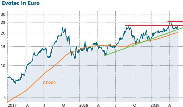 Aus charttechnischer Sicht ist die Aktie von Evotec nun an einen wichtigen Widerstand herangelaufen: an das Septemberhoch 2019 bei 23,36 Euro. Hier gilt es nun: Gelingt auch der Sprung über diese Hürde, wäre dies ein klares charttechnisches Kaufsignal. Die Aktie dürfte dann relativ schnell in Richtung des im April dieses Jahres bei 25,83 Euro markierten Mehrjahreshochs laufen. Anleger, die der Empfehlung des AKTIONÄR im Oktober vergangenen Jahres gefolgt sind, liegen mittlerweile gut 34 Prozent in Front. DER AKTIONÄR empfiehlt, die Gewinne weiter mit einem Stopp bei 17,30 Euro laufen zu lassen. Auch Neueinsteiger können noch zugreifen, wenn das Signal generitert wird. Mittelfristig rechnet DER AKTIONÄR mit Kursen im Bereich von 30 Euro.