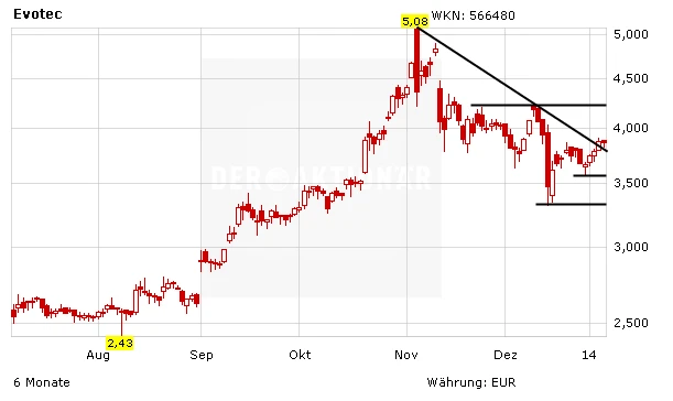 Nachdem sich die Aktie von Evotec in der zweiten Jahreshälfte 2013 zwischenzeitlich mehr als verdoppeln konnte, ist sie vor dem Jahreswechsel deutlich unter Druck geraten. Grund für den Einbruch, dass Evotec bedeutende Meilensteinzahlungen in Höhe von rund sechs Millionen Euro nicht erzielen konnte und das Unternehmen die Umsatzprognose für das Gesamtjahr 2013 nach unten anpassen musste.