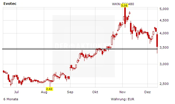 Die Aktie von Evotec ist am Freitag nach einem Rückschlag in der Wirkstoffentwicklung auf Talfahrt gegangen. Zeitweise sackte das Papier mehr als 15 Prozent auf 3,32 Euro ab und damit sogar unter das 2011er-Hoch bei 3,48 Euro. Damit wurde auch der Stoppkurs des AKTIONÄR bei 3,40 Euro erreicht und die Aktie mit einem Gewinn von 16 Prozent verkauft.