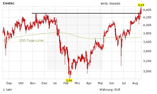 Die Aktie von Evotec konnte bereits in der vergangenen Woche deutlich zulegen und den Aufwärtstrend auch in der neuen Woche fortsetzen. Bei 4,49 Euro erreicht der Wert sogar ein neues 52-Wochen-Hoch. Nun gilt es, den Ausbruch nachhaltig zu bestätigen. Die nächste charttechnische Zielmarke ist das Mehrjahreshoch bei 5,08 Euro. Anleger bleiben bei Evotec in jedem Fall weiter investiert beziehungsweise können auch auf dem aktuellen Niveau noch einsteigen. Langfristig ist das Unternehmen eines der interessantesten deutschen Biotechwerte.