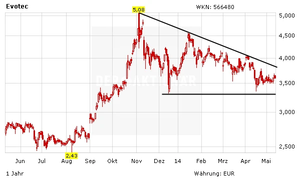 Die Aktie von Evotec zählt nach der Veröffentlichung der Zahlen zu den größten Verlierern im TecDAX. Das Papier gibt 1,2 Prozent auf 3,60 Euro nach. Langfristig sieht der AKTIONÄR Evotec aber nach wie vor als äußerst aussichtsreichen deutschen Biotechwert, auch wenn die jüngsten Zahlen für keine positive Überraschung sorgen konnten. Noch drängt sich insbesondere aus charttechnischen Gesichtspunkten allerdings kein Wiedereinstieg auf. Anleger sollten den Wert auf ihre Watchlist setzen.