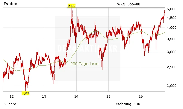 Nachdem die Aktie von Evotec die Anleger lange Zeit auf eine harte Geduldsprobe gestellt hatte, hat sie zuletzt für wahre Freudensprünge gesorgt. Nahezu ohne Pause marschierte das Papier in den vergangenen Wochen von 3,50 Euro auf zuletzt knapp fünf Euro durch. Damit notiert der Wert nur knapp unterhalb des 5-Jahres-Hochs im Bereich von 5,08 Euro. Zuletzt haben sich auch die Analysten des Düsseldorfer Bankhauses Lampe erneut positiv zu Evotec geäußert. Anlässlich einer weiteren Forschungskooperation mit Bayer haben die Experten den Wert auf "Kaufen" mit einem Kursziel von 5,40 Euro bewertet. Eine erprobte Partnerschaft dürfte schnelle Ergebnisse bringen, erklärte Analyst Volker Braun. Die finanziellen Bedingungen hält er für attraktiv.