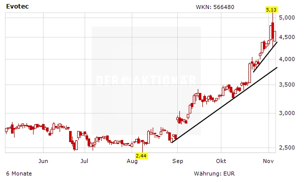 Nach einem schwachen Vortag meldet sich die Aktie von Evotec am Mittwoch eindrucksvoll zurück. Der Biotech-Titel klettert derzeit mehr als sechs Prozent auf 4,64 Euro und ist damit wieder einmal der beste Wert im TecDAX. Am Dienstag hatte Evotec kurzzeitig sogar die Marke von fünf Euro übertroffen und mit 5,18 Euro ein neues Mehrjahreshoch erreicht. Dann setzten allerdings Gewinnmitnahmen ein, die nach der starken Rallye-Bewegung zuletzt aber keineswegs ungewöhnlich sind. Aus charttechnischer Sicht positiv: Der kurzfristige Aufwärtstrend wurde erfolgreich bestätigt.