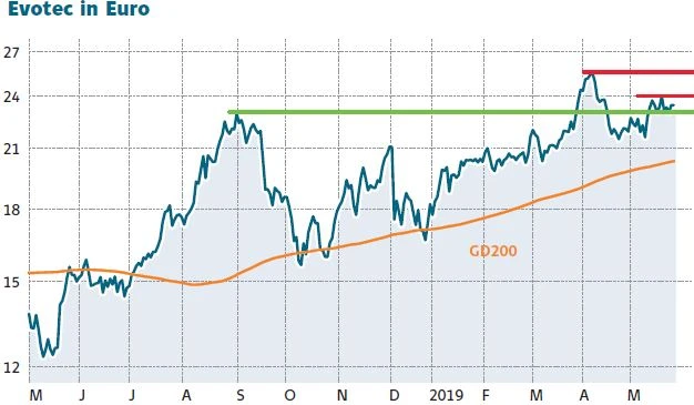 Seit einiger Zeit bereits kämpft die Aktie von Evotec mit der Marke von 23,36 Euro, dem Septemberhoch 2018. Am heutigen Dienstag startet das Papier nun einen neuen Anlauf. Mehr als zwei Prozent gewinnt der Biotechwert auf 23,51 Euro. Damit ist Evotec ganz knapp hinter der Norma Group und ProSiebenSat.1 Media (jeweils plus 2,2 Prozent) der drittbeste Wert im MDAX des Tages. Auf dem Weg in Richtung Jahreshoch bei 25,83 Euro gilt es noch, das Maihoch bei 24,08 Euro zu überwinden.