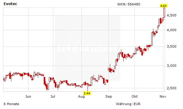 Spannend wird es, ob Evotec die nächste Hürde - das 2006er-Hoch bei 4,88 Euro - direkt nehmen kann. Anleger bleiben angesichts der starken Verfassung weiter investiert, sollten ihre Position aber mit einem Stopp im Bereich von 3,50 Euro absichern.
