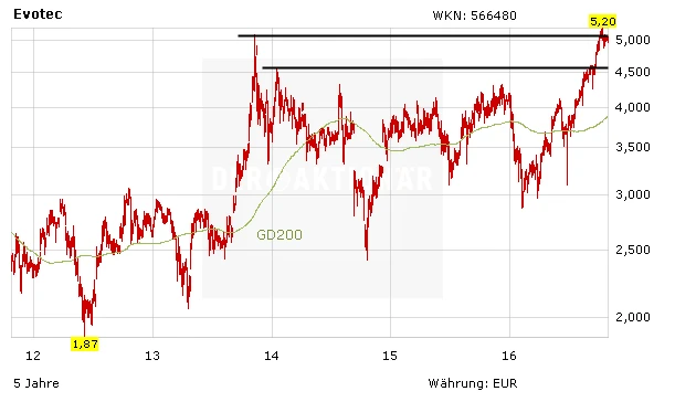 Die Aktie von Evotec reagiert auf die Meldung mit einem leichten Plus von 0,7 Prozent auf 5,05 Euro. Nach der seit Wochen andauernden Aufwärtsbewegung bei der Aktie, gönnt sich der Wert derzeit im Bereich der 5-Euro-Marke eine Verschnaufpause. Gelingt der Aktie der nachhaltige Ausbruch über das 2013er-Hoch bei 5,08 Euro und das vor Kurzem bei 5,20 Euro markierte Jahreshoch, wäre der Weg aus charttechnischer Sicht frei bis in den Bereich von sieben Euro.