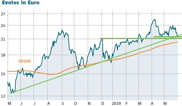 Die massive Schwäche an den Märkten zuletzt hat auch die Aktie von Evotec mit nach unten gezogen. Das Papier rutschte nicht nur unter das 2018er-Hoch bei 23,36 Euro zurück, sondern auch unter den Support bei 21,50 Euro, dem Apriltief 2019. Damit steuert die Aktie direkt auf die nächste enorm wichtige Unterstützung zu: den mittelfristigen Aufwärtstrend sowie die 200-Tage-Linie. Im Bereich von 20 Euro verläuft eine breite Unterstützungszone.