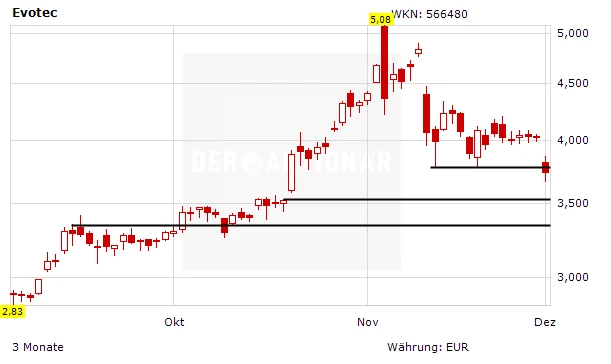 Kritisch wird es, sollte sich die Aktie bis Handelsende nicht mehr über die alte Unterstützung bei 3,78 Euro hangeln. Dann drohen weitere Rücksetzer. Zunächst einmal dürfte Evotec die Kurslücke bei 3,53 Euro - die am 18. Oktober aufgerissen wurde - schließen. Anschließend böte noch die Marke von 3,48 Euro Support.