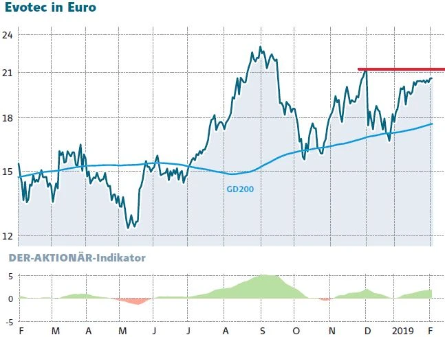 Auch wenn die Aktie von Evotec derzeit auf der Stelle tritt, im Jahresvergleich gehört das Papier mit plus 32 Prozent zu den sieben besten Werten im MDAX. Nur Carl Zeiss Meditec, Nemetschek, Puma, TAG Immobilien, MTU Aero Engines und Innogy entwickelten sich besser. Damit ist Evotec der mit Abstand beste Biotechwert. Und die jüngste Konsolidierung ist angesichts der starken Aufholjagd in den Wochen zuvor keineswegs ungewöhnlich. Der nächste Widerstand, den es auf dem Weg in Richtung Allzeithoch bei 23,36 Euro zu überwinden gilt, wartet in Form des Dezember-Zwischenhochs 2018 bei 21,82 Euro.