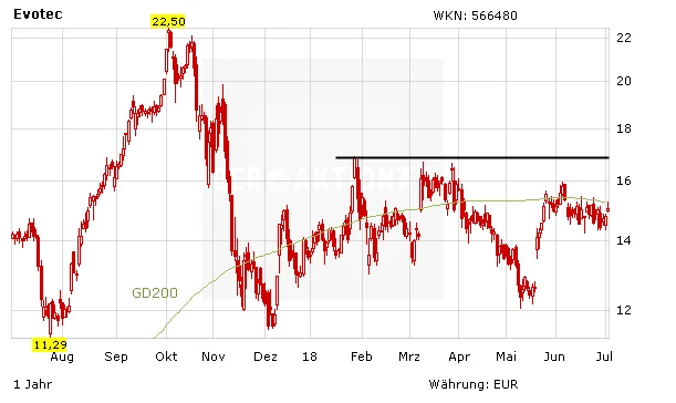 Die Aktie von Evotec legt im Zuge der heutigen Meldung 1,7 Prozent auf 15,05 Euro zu. Noch immer hängt der Wert allerdings am Widerstand in Form der 200-Tage-Linie fest. Ein Sprung darüber würd ein positives charttechnisches Signal bedeuten. Der nächste wichtige Widerstand würde dann im Bereich von 17 Euro warten. Ein Ausbruch darüber wäre ein klares Kaufsignal. Evotec ist erstklassig aufgestellt. Das aktuelle Niveau sind langfristig klare Kaufkurse bei der Aktie.
