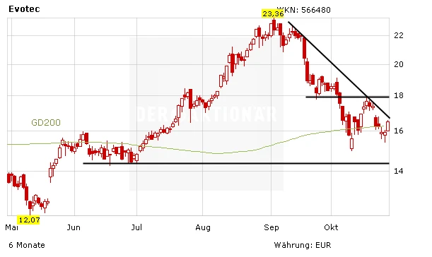 In den kommenden Wochen stehen derweil bei Evotec mehrere wichtige Termine auf der Agenda. Das Unternehmen präsentiert auf der Jefferies London Healthcare Conference, die vom 14. bis 15. November stattfindet, sowie vom 26. bis 27. November auf dem Deutschen Eigenkapitalforum in Frankfurt. Zudem sollten sich Anleger den 13. November notieren. Dann veröffentlicht Evotec den 9-Monatsbericht. Evotec bleibt im europäischen Biotechsektor weiterhin erste Wahl. Kurzfristig ist nun wichtig, dass sich die Aktie von der 200-Tage-Linie nach oben absetzen kann.