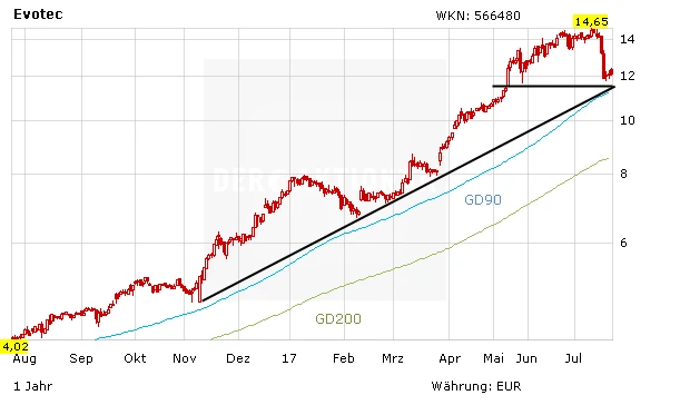 Nach einer monatelangen Rallye ist die Aktie von Evotec zuletzt zunächst am Widerstand bei 14,50 Euro gescheitert. Die folgende Korrekturbewegung ist angesichts des vorausgegangenen Anstiegs nicht ungewöhnlich und durchaus gesund. Zuletzt ist das Papier auf die Unterstützung im Bereich von zwölf Euro aufgelaufen. Knapp darunter verlaufen auch die 90-Tage-Linie und der mittelfristige Aufwärstrend. Diese gilt es nun zu verteidigen. Bei Evotec gilt weiterhin: Das Unternehmen ist eines der besten deutschen Biotech-Werte, größere Rücksetzer sind hier Kaufchancen.