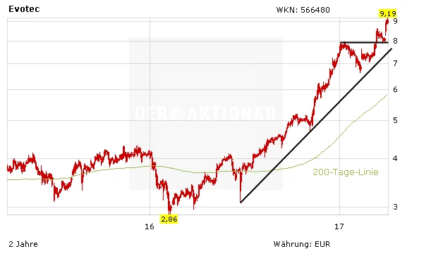 Evotec bietet sich de facto auch für konservative, langfristig orientierte Anleger an. Größere Rücksetzer bleiben beim TecDAX-Titel klare Kaufchancen. Zweistellige Kurse und damit neue Mehrjahreshochs sind angesichts der Perspektiven nur eine Frage der Zeit. Gewinne laufen lassen!