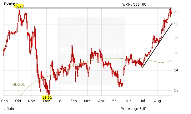 Mit dem jüngsten Kursanstieg könnte bereits der nächste Angriff auf das 52-Wochen-Hoch bei 22,70 Euro unmittelbar bevorstehen. Ein Sprung darüber wäre ein weiteres klares Kaufsignal für die Aktie. Ob dieser zweite Ausbruchsversuch nun von Erfolg gekrönt sein wird, bleibt abzuwarten, langfristig dürfte dies aber keine allzu große Hürde darstellen. Das mittelfristige Kursziel für die Evotec-Aktie sieht DER AKTIONÄR bei 30 Euro.