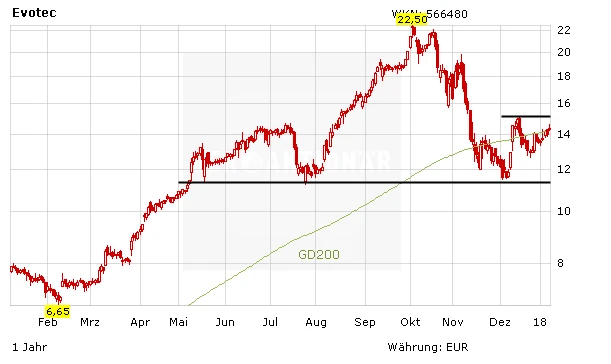 Die Aktie von Evotec reagiert auf die Meldung mit einem kräftigen Kursplus. Mehr als drei Prozent auf 14,43 Euro geht es nach oben. Damit hat Evotec den ersten wichtigen Widerstand in Form der 200-Tage-Linie überwunden. Nun gilt es allerdings, relativ schnell die nächste Hürde bei 15,15 Euro zu nehmen. Langfristig orientierte Anleger sollten das nach der jüngsten Korrektur aktuell wieder günstige Niveau nutzen und sich ein paar Stücke dieses enorm stark aufgestellten Biotechwerts ins Depot legen.