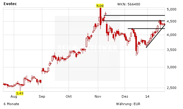 Unterstützung erhält das Papier im Bereich von 4,24 Euro, dem Dezemberhoch 2013. Anleger bleiben angesichts der guten Aussichten und des nach wie vor positiven Chartbilds bei dem Wert weiter investiert und sichern ihre Position mit einem Stopp bei 3,30 Euro nach unten ab. In den kommenden Wochen dürfte Evotec Kurs auf die 5-Euro-Marke nehmen.