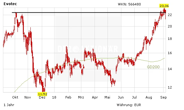 Obwohl beides eigentlich gute News sind, kann die Aktie von Evotec derzeit allerdings nicht profitieren. Sie verliert am Vormittag 1,9 Prozent auf 22,24 Euro und fällt damit wieder unter den wichtigen Widerstand im Bereich von 22,70 Euro zurück. Anlass zur Beunruhigung ist dies aber nicht. Nach der starken Rallye ist eine etwas ausgedehntere Konsolidierung insbesondere bei einem derart starken Widerstand nicht ungewöhnlich. Noch nicht investierte Anleger können auf noch einmal auf eine etwas günstigere Einstiegschance hoffen, alle anderen lassen ihre Gewinne laufen und setzten die derzeitige Konsolidierung aus. Bis Evotec den nachhaltigen Ausbruch nach oben schafft, dürfte nur eine Frage der Zeit sein. Aus fundamentaler Sicht stehen die Ampeln in jedem Fall klar auf Grün.