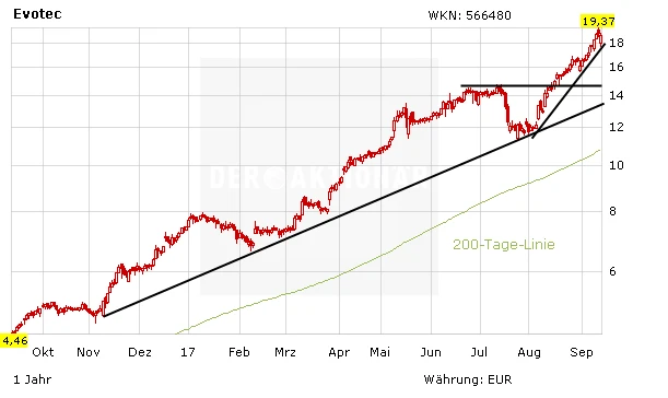 Die Evotec-Aktie hat mit dem Jahreshoch bei 19,37 Euro den höchsten Stand seit 16 Jahren erklommen. Nach wie vor ist der langfristige Aufwärtstrend intakt. Daher gilt: Investierte Anleger bleiben an Bord. Neueinsteiger hingegen warten eine größere Korrektur ab. Im Bereich von 14,70 Euro lohnt ein Neueinstieg mit Stopp bei 11,90 Euro.