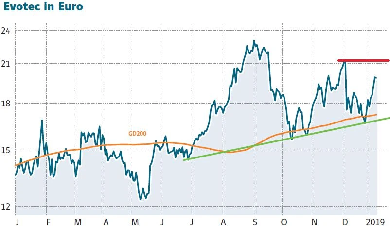 Die Aktie von Evotec hat in den vergangenen Tagen deutliche Zugewinne verzeichnen können. Im Wochenvergleich ist das Papier der achtbeste Wert im MDAX, im Monatsvergleich ist die Biotech-Gesellschaft sogar auf Platz 3 zu finden. Am heutigen Donnerstag legt die Aktie nun knapp vor der insbesondere psychologisch wichtigen 20-Euro-Marke eine Verschnaufpause ein. Vielleicht ein kurzes Durchatmen vor der heutigen Präsentation auf der 37th J.P. Morgan Healthcare Conference in San Francisco. Um 17 Uhr deutscher Zeit wird dort der Vorstandsvorsitzende Werner Lanthaler Evotec präsentieren. Dies ist der bedeutende Anfang eines ganzen Konferenzen-Marathons im Januar. Es folgt das ODDO BHF Forum in Lyon, Frankreich. Vom 21. bis 23. Januar ist Evotec auf 18th German Corporate Conference 2019 in Frankfurt vertreten sowie am 31. Januar auf dem Bankhaus Lampe German Equity Forum in London. Einen wichtigen Termin können sich Anleger darüber hinaus gleich für Ende März vormerken. Am 28. März legt Evotec den Geschäftsbericht für 2018 vor.