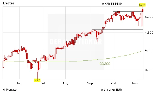Das Papier von Evotec hat auf die Meldung zunächst mit einem deutlichen Kurssprung auf ein neues Mehrjahreshoch bei 5,36 Euro reagiert, hat aber im Tagesverlauf die Gewinne wieder abgeben müssen. Die Aktie ist dabei auch unter das Ausbruchsniveau von 5,20 Euro zurückgefallen. Kurzfristig ist nun wichtig, dass diese Marke nachhaltig überwunden werden kann. Langfristig dürfte die Aktie den Anlegern ohnehin noch viel Freude bereiten.