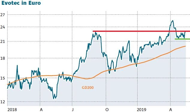Die Aktie von Biotech hat zuletzt durch die Veröffentlichung der Ergebnisse für das erste Quartal neuen Aufwind erfahren. Hier gelang es der Gesellschaft den Umsatz um 27 Prozent auf 104 Millionen Euro zu steigern. Noch besser lief es beim Gewinn. Das bereinigte Ergebnis vor Zinsen, Steuern und Abschreibungen konnte Evotec auf auf 30 Millionen Euro mehr als verdoppeln. Analysten hatten mit einem weniger deutlichen Umsatz- und Ergebnisanstieg gerechnet. Unter dem Strich verdiente Evotec gut 13 Millionen Euro, nach 3,5 Millionen ein Jahr zuvor. Hervorzuheben ist außerdem die starke Liquiditätsposition. Diese beläuft sich trotz der zuletzt vollständigen Rückzahlung der Brückenfinanzierung, die im Zusammenhang mit der Aptuit-Akquisition im Jahr 2017 vereinbart worden war, auf 141,6 Millionen Euro. Gleichzeitig bestätige der Biotechkonzern die Jahresziele für 2019. Sowohl der Umsatz als auch das bereinigte Ebitda sollen um jeweils zehn Prozent zulegen.