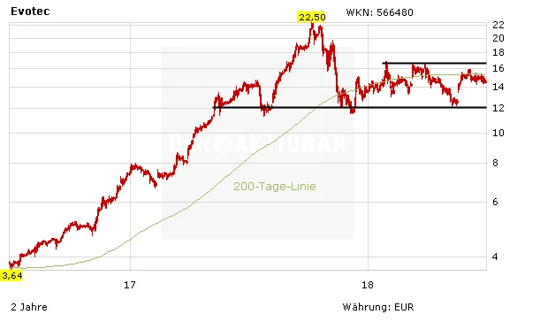 Trotz vieler positiver Nachrichten ist es der Evotec-Aktie nicht gelungen, den seit Monaten bestehenden Seitwärtstrend nach oben zu verlassen. Laut einer Studie des Bankhaus Lampe dürfte dies allerdings nur noch eine Frage der Zeit darstellen – die Analysten halten unverändert an der positiven Einschätzung für den Hamburger Wirkstoffforscher fest und beziffern das Kursziel der Kaufempfehlung unverändert auf 26 Euro. Dies impliziert ein Upside-Potenzial von satten 80 Prozent.