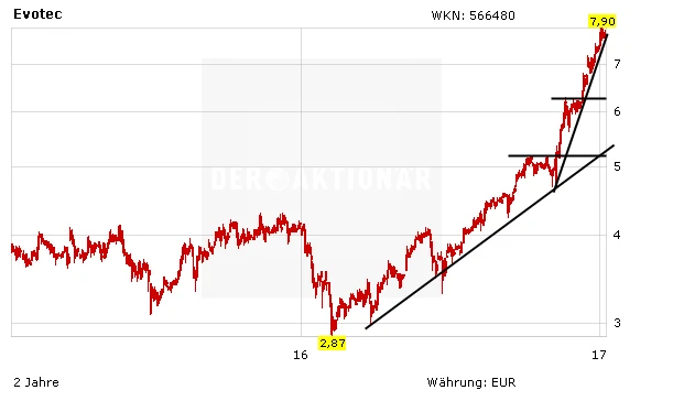 Die Aktie von Evotec reagiert positiv auf die Meldung. Am Vormittag gewinnt das Papier 1,2 Prozent auf 7,75 Euro. Nach einem fulminanten Zwischenspurt sei Anfang November vergangenen Jahres hängt Evotec derzeit am Widerstand bei acht Euro fest. Gelingt auch der Sprung darüber, wäre dies ein weiteres positives Signal. Die nächste größere Zielmarke liegt bei zehn Euro. Evotec bleibt eines der aussichtsreichsten deutschen Biotech-Unternehmen. Größere Rücksetzer sind hier klare Kaufchancen. Investiere Anleger lassen ihre Gewinne laufen.