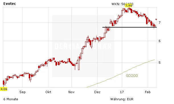 Die Aktie von Evotec startet nach Bekanntgabe der News ordentlich durch. Am frühen Vormittag gewinnt das Papier 6,6 Prozent auf 7,30 Euro. Die Konsolidierungsphase der vergangenen Woche ist damit beendet. Evotec dürfte nun wohl einen Angriff auf das jüngste Hoch im Bereich von 8,00 Euro starten. In jedem Fall weiter investiert bleiben! Die Evotec-Aktie bleibt weiterhin eine der interessantesten deutschen Biotech-Werte.