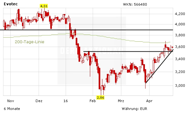 Die Aktie von Evotec gewinnt am Dienstagvormittag 1,3 Prozent auf 3,60 Euro. Zuletzt gelang dem Wert der Sprung über den Widerstand bei 3,50 Euro. Kann Evotec nun auch die 200-Tage-Linie überwinden, wäre dies ein weiteres positives Signal für die Aktie. Der Wert bleibt weiter aussichtsreich.