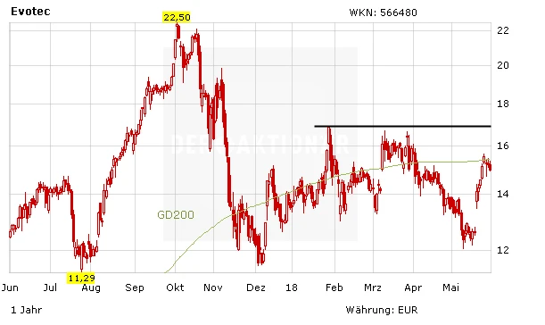 Charttechnisch ist die Aktie zuletzt an die 200-Tage-Linie heran gelaufen, daran allerdings im ersten Anlauf abgeprallt. Wichtig wäre nun, der Sprung über diese Hürde. Dies wäre ein erstes Kaufsignal und dürfte Dynamik in den Wert bringen, um auch den nächsten Widerstand im Bereich von 17 Euro zu nehmen. Auf dem aktuellen Niveau ist Evotec ein klarer Kauf.
