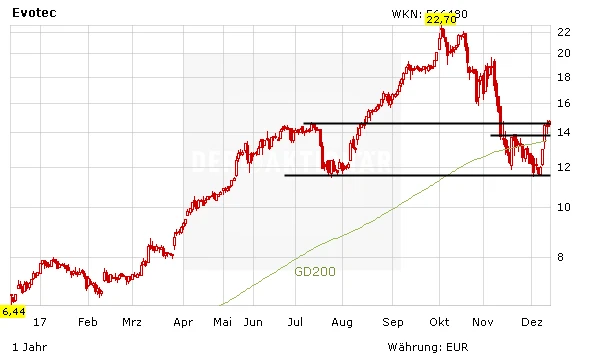 Die Aktie von Evotec hat nach der monatelang andauernden Korrektur zuletzt wieder kräftig Fahrt aufgenommen. Dabei gelang es der Aktie gleich mehrere wichtige Widerstände zu knacken: zum einen die 200-Tage-Linie, zum anderen die Horizontalen bei 14 und 14,70 Euro. Anleger lassen bei der Aktie ihre Gewinne laufen, sichern ihre Position aber mit einem Stopp bei 10,00 Euro nach unten ab.