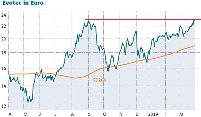 Auch 2019 peilt das Unternehmen weitere Zuwächse. Die Konzernerlöse aus Verträgen mit Kunden, ohne Erlöse aus Weiterbelastungen, ohne Erlöse aus Weiterbelastungen, sollen um rund zehn Prozent wachsen, so Evotec in einer Mitteilung. Diese Annahme beruhe auf dem derzeitigen Auftragsbestand, den absehbaren Neuverträgen und Vertragsverlängerungen sowie den Aussichten auf Meilensteinzahlungen. Die Prognose basiert auf unveränderten Wechselkursen gegenüber 2018. Auch das bereinigte Konzern-EBITDA soll um etwa zehn Prozent zulegen. Im Laufe des Tages wird zudem der Vorstand, Werner Lanthaler, einen Ausblick auf das laufende Geschäftsjahr geben.