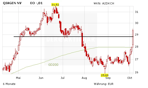 Ein kräftiges Kaufsignal hat zuletzt auch Qiagen geliefert. Am Freitag gelang dem Wert der Ausbruch über die 200-Tage-Linie. Beflügelt wurde die Aktie von der Meldung, dass QuantiFERON-TB Gold Plus (QFT-Plus), der führende Bluttest der vierten Generation zur Erkennung von Tuberkulose, auf dem US-amerikanischen Markt eingeführt wurde. QFT-Plus-Kits wurden im Juni durch die Food and Drug Administration (FDA) zugelassen und sind ab dem 9. Oktober 2017 für den Einsatz in der Diagnostik erhältlich.