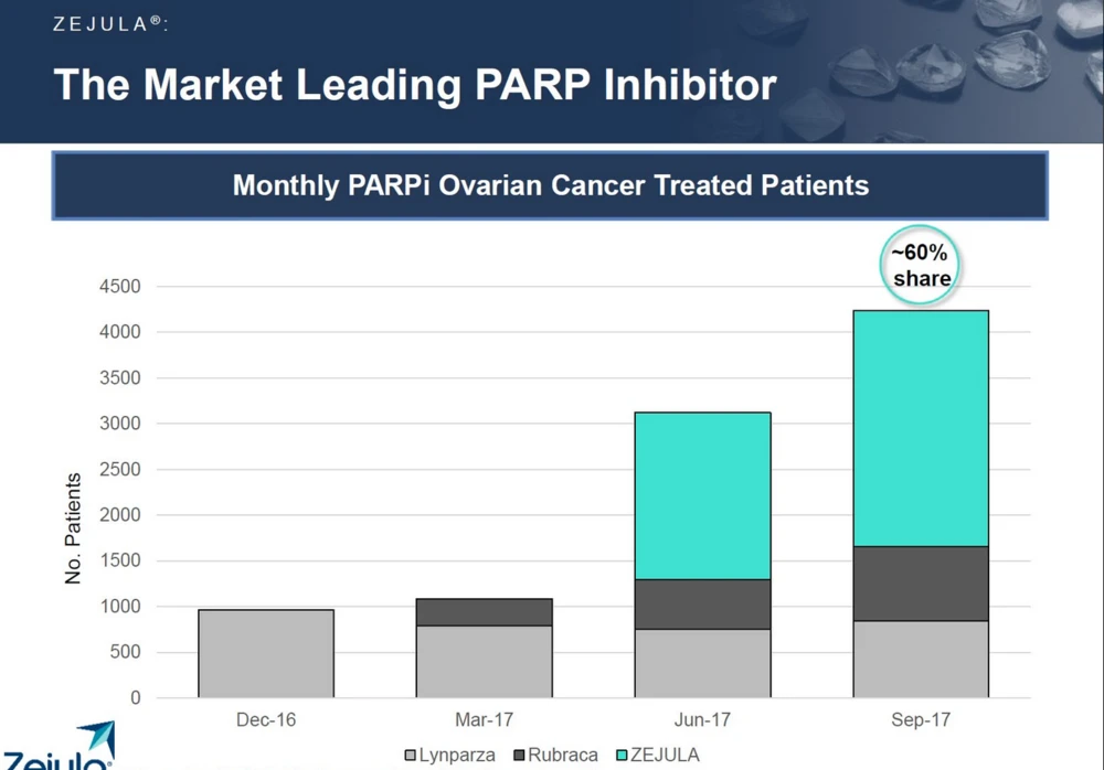 Der Markt mit PARP-Inhibitoren (eine Klasse von Enzymhemmern) gilt als einer der stärksten Wachstumsbereiche in der Onkologie. Den Milliardenmarkt in der Indikation Eierstockrebs teilen sich Astrazeneca mit Lynparza, Clovis Oncology mit Rubraca und Tesaro mit Zejula. Gespannt blicken Investoren auf die Umsatzentwicklung der Firmen – Tesaro traf die Analystenschätzung mit dem potenziellen Blockbuster. Doch die Konkurrenz schläft bekanntlich nicht.