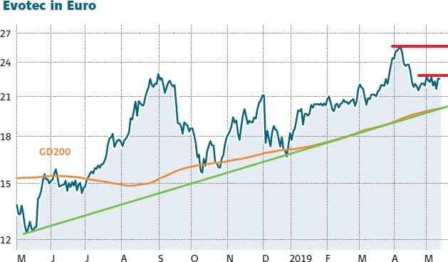 Die Aktie von Evotec gewinnt am heutigen Dienstag mehr als drei Prozent auf 22,43 Euro. Damit ist Evotec nach K+S der zweitbeste Wert des Tages im MDAX. Grund sind starke Zahlen für das erste Quartal. Zudem wurde die Jahresprognose bestätigt. Dank zahlreicher neuer Kooperationen und Meilensteinzahlungen etwa vom Partner Bayer hat Evotec seinen Umsatz zum Jahresstart deutlich erhöhen können. Der Umsatz kletterte in den ersten drei Monaten des laufenden Jahres auf 104 Millionen Euro – das sind 27 Prozent mehr als im Vergleichszeitraum des Vorjahres.