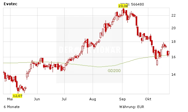 Betrachtet man die charttechnische Entwicklung der beiden deutschen Biotech-Top-Player Evotec und Morphosys, so zeigt sich eine fast parallele Entwicklung. Beide Unternehmen haben nach einer starken Performance zuvor, zuletzt deutlich verloren. Während Morphosys dabei auch unter die 200-Tage-Linie gerutscht ist, kämpft Evotec noch mit der Verteidigung dieses wichtigen Supports. Am heutigen Mittwoch kann sich Evotec mit einem Plus von zwei Prozent auf 16,57 Euro zumindest wieder etwas Luft verschaffen. Morphosys kann hingegen nur leicht zulegen – um 0,4 Prozent auf 80,50 Euro. Hier wartet die 200-Tage-Linie erst jenseits der 90-Euro-Marke.