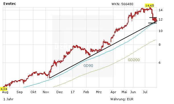 Die Aktie von Evotec reagiert am Donnerstag mit einem deutlichen Kurszuwachs von zwei Prozent. Der Wert befindet sich allerdings nach der monatelangen Rallyephase, die Evotec bis an den Widerstand bei 14,50 Euro herangeführt hat, im Konsolidierungsmodus. Aus charttechnischer Sicht ist wichtig, dass kein neues Tief markiert wird. Das jüngste Zwischentief lag bei 11,44 Euro. In diesem Bereich verlaufen auch die 90-Tage-Linie und der mittelfristige Aufwärtstrend. Ein klares positives Signal würde generiert, wenn die Aktie die Hürde bei 12,50 Euro zurückerobern kann. Langfristig bleibt es dabei: Evotec ist weiterhin einer der besten deutschen Biotech-Werte.