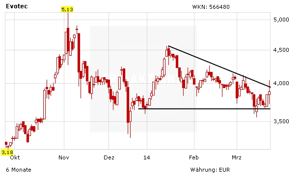 Die Aktie stand in den vergangenen Wochen erheblich unter Druck. Im Zuge der Korrektur ist das Papier auch nur knapp am Stoppkurs des AKTIONÄR bei 3,30 Euro vorbeigeschrammt. Zuletzt konnte sich die Aktie des im TecDAX notierten Biotech-Unternehmens aber wieder deutlich erholen. DER AKTIONÄR geht davon aus, dass mit diesen Zahlen die Bilanz endgültig bereinigt sein sollte und ist daher weiter optimistisch, was die Entwicklung der Evotec-Aktie angeht. Gelingt der nachhaltige Sprung über kurzfristigen Abwärtstrend, wäre dies als neues Kaufsignal mit Ziel 4,60 Euro zu werten.