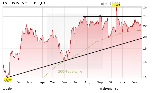 Seit mehreren Monaten notiert die Exelixis-Aktie seitwärts. Mit der schnellen Zulassungserweiterung im Rücken dürften die Papiere nun einen weiteren Versuch starten, die Schiebezone nach oben zu verlassen. Dann sollte der Knoten platzen. Auf dem aktuellen Niveau ist die Aktie ein klarer Kauf für spekulative Anleger mit Stopp bei 18,00 Euro.
