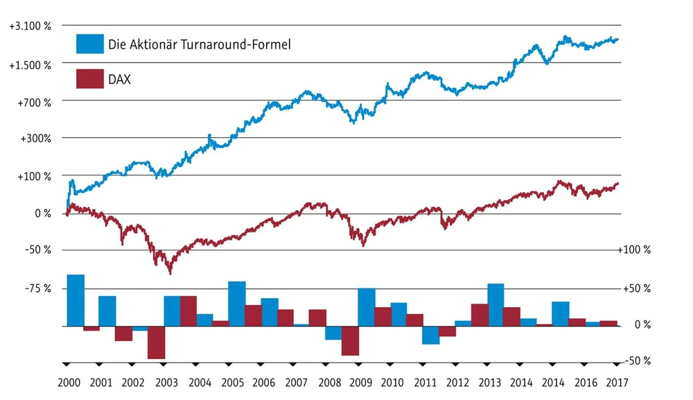 Für Florian Söllner ist die Juni-Ausgabe des Turnaround-Report daher „die bisher spannendste Ausgabe mit den besten Aktien“. Nachdem das Screening aus Tausenden Aktien eine Handvoll ausgewählt hat, ist das Team in die Tiefe gegangen und hat für die neue Ausgabe mit mehreren Vorständen der Firmen direkt und exklusiv gesprochen. Das System funktioniert: Die Durchschnittsrendite der Formel seit dem Jahr 2000 liegt mit 20 Prozent pro Jahr deutlich über der des DAX (3 Prozent p. a. im Vergleichszeitraum). Seit der ersten Ausgabe im Februar beläuft sich die reale Outperformance bereits auf 16 Prozent.