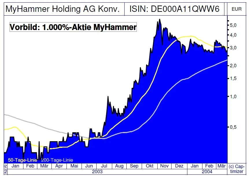 Große Chance: DER AKTIONÄR hat in langer Feinarbeit die Kursverläufe von 1.000-Prozent-Aktien analysiert. Vielen war gemeinsam: eine spezielle Bodenbildung und eine besondere Formation beim Start-Ausbruch der extremen Kursbewegung. Das Ergebnis ist die AKTIONÄR Turnaround-Formel. „Mit diesem System wird auch die MyHammer von morgen gefunden“, so Dr. Dennis Riedl, der das System mitentwickelt hat. In dieser Ausgabe weist die Formel nun auf eine Aktie hin, die nicht nur beim Chart, sondern kurioserweise auch vom operativen Geschäft her Ähnlichkeiten zur Kursvervielfacher-Aktie MyHammer aufweist. „Der Traffic entwickelt sich unglaublich schnell“, so der Vorstand. Es handelt sich um eine Art Start-up, wie auch Staramba eines ist. Die Staramba-Aktie ist nach dem Signal aus der Turnaround-Formel in der Spitze um 370 Prozent gestiegen.
