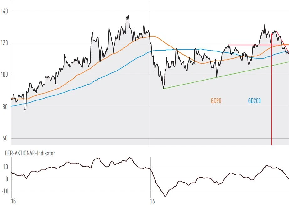 Expedias Konsolidierung nach Erreichen des Jahreshochs hält aufgrund des schwachen Trivago-Börsengang weiter an – seit Jahreshoch minus 15 Prozent. Die Aktie ist unter die mehrfach getestete Unterstützung im Bereich 118 Dollar gefallen und durchbrach die 200-Tage-Linie in einer bullishen Manier. Anleger beachten den Stopp des AKTIONÄRS bei 95 Euro.