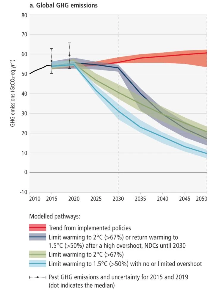 Die neue Grafik im Report zeigt, dass bisherige Maßnahmen bereits gewisse Effekte zeigen, doch zur großen Trendumkehr noch viel zu tun ist. Immerhin: „Das Tempo der Steigerung der Emissionen hat sich verlangsamt.“ Doch ohne „sofortige und tiefgreifende Reduzierungen“ schädlicher Abgase über alle Sektoren hinweg, ist die Reduzierung der Erderwärmung auf 1,5 Grad „außerhalb der Reichweite.“